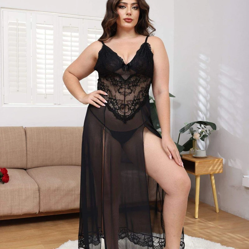 Plus Size Luxury Lace Long Night Gown for Women – Elegant Sheer Maxi Sleepwear