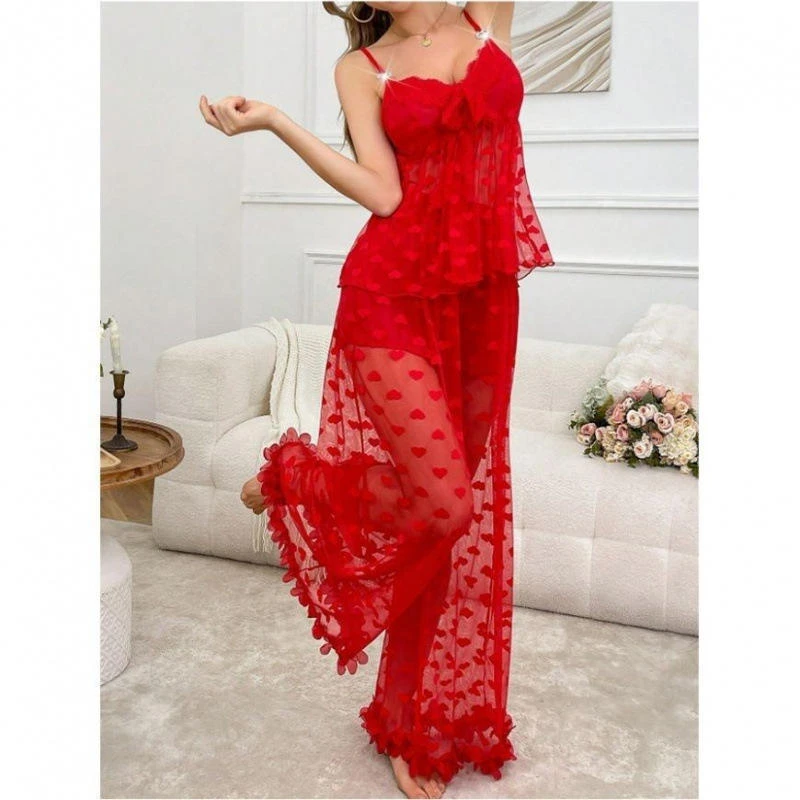 Romantic Red Mesh Nightwear Set for Women – Elegant 2 Piece Sheer Loungewear